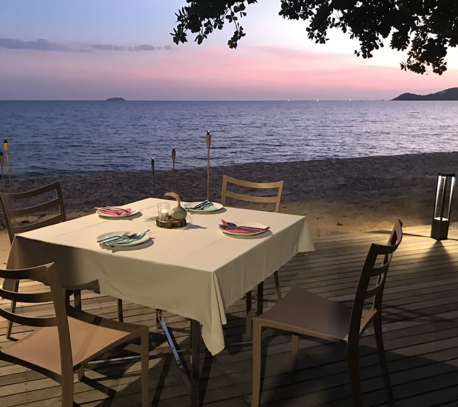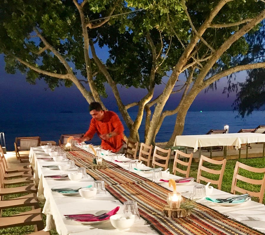 มื้อเย็นสามารถเลือกจัดโต๊ะอยู่ที่ระเบียงไม้ริมทะเล หรือ สนามหญ้าในบรรยากาศสบายๆ ผ่อนคลายรับลมทะเลรอพระอาทิตย์ตก หรือ จะนั่งทานในห้องอาหารที่บริเวณล็อบบี้ก็ได้ ไม่ว่าคุณจะนั่งทานที่ไหน อาหาร home-cooked ที่พิถีพิถันก็พร้อมเสิร์ฟให้คุณเสมอ